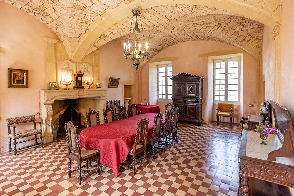 Eetkamer (46 m²): met aangrenzend kantoor en indrukwekkende stenen open haard, geschikt voor gezamenlijke diners aan de grote jachttafel.