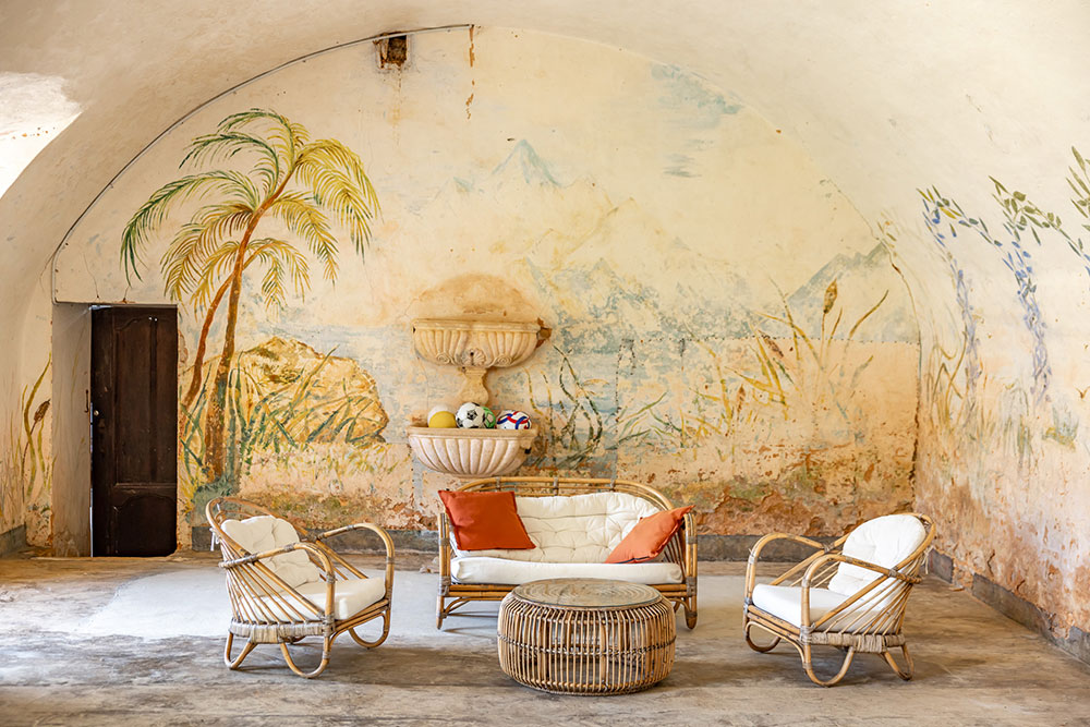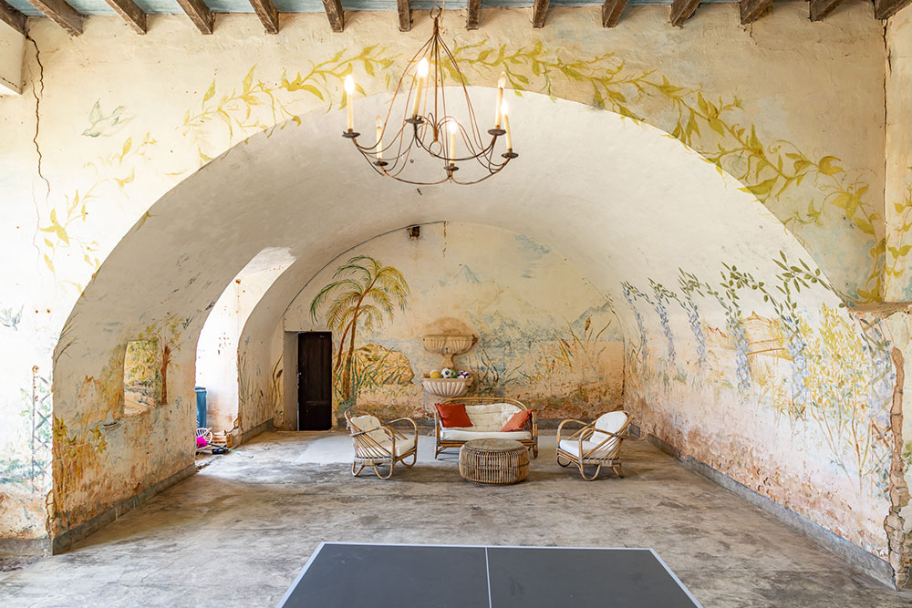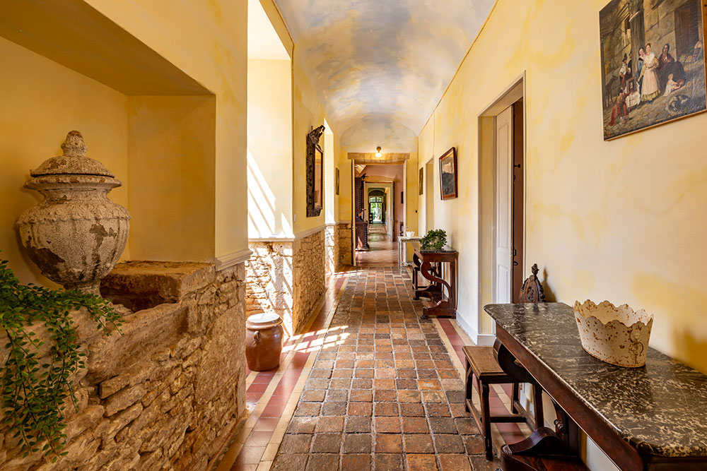 Een lichte hal met 17e-eeuwse terracotta tegels verbindt de gewelfde kamers van het huis en straalt historische charme uit.